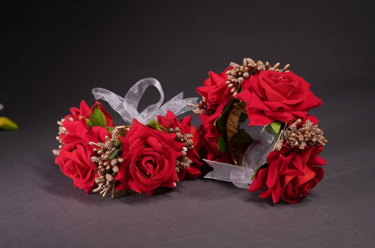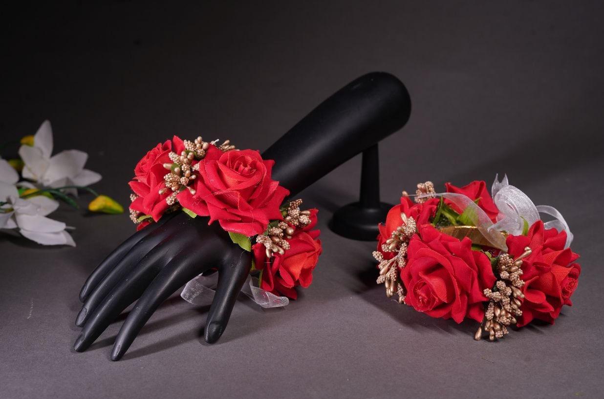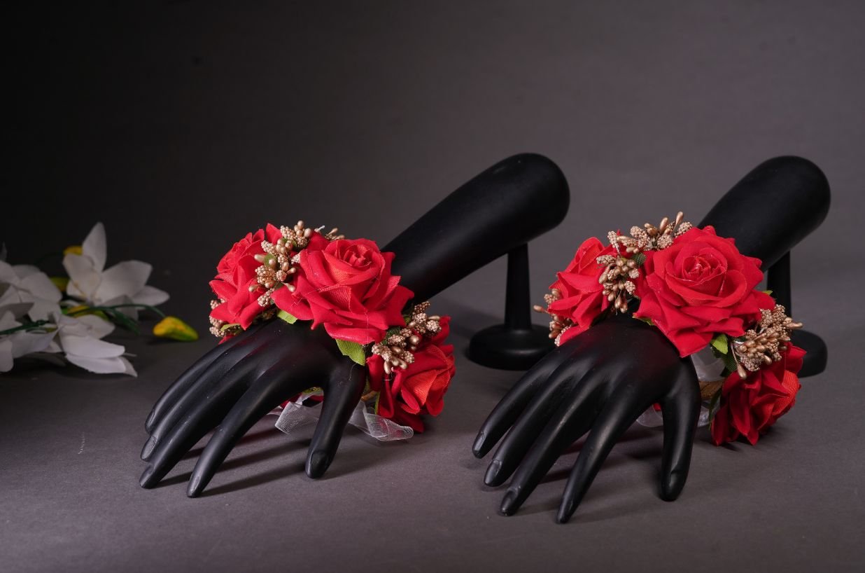 The Red Flower with Golden Pollen Hand Bracelet is a stunning piece that combines bold red flowers with the elegance of golden pollen accents. Handmade with precision, this bracelet adds a vibrant and luxurious touch to any look. Perfect for brides, bridesmaids, or special occasions, its eye-catching design enhances your beauty with a blend of rich color and delicate details. Ideal for those who want to make a statement, this floral hand bracelet is perfect for weddings, parties, or any memorable event.