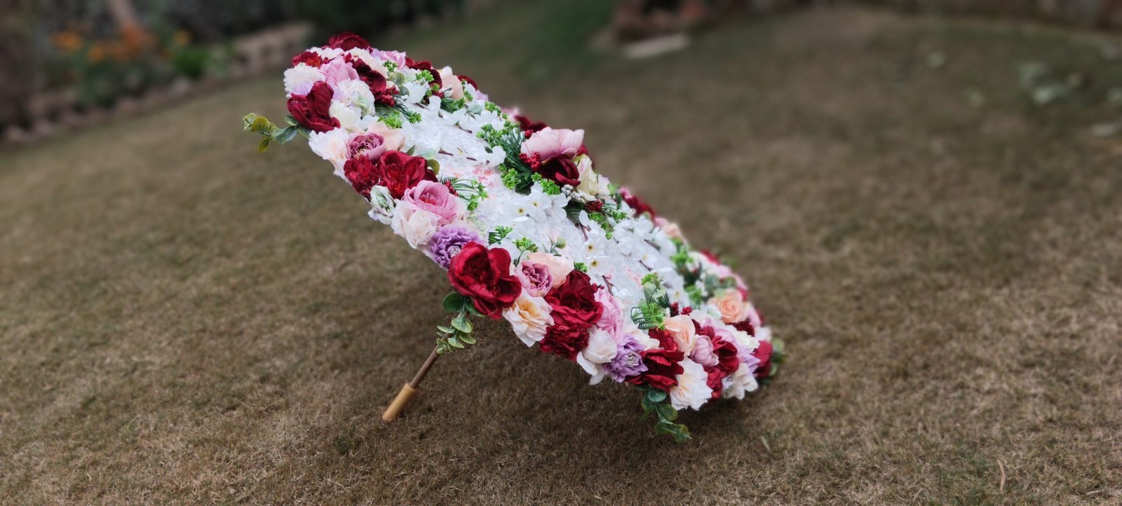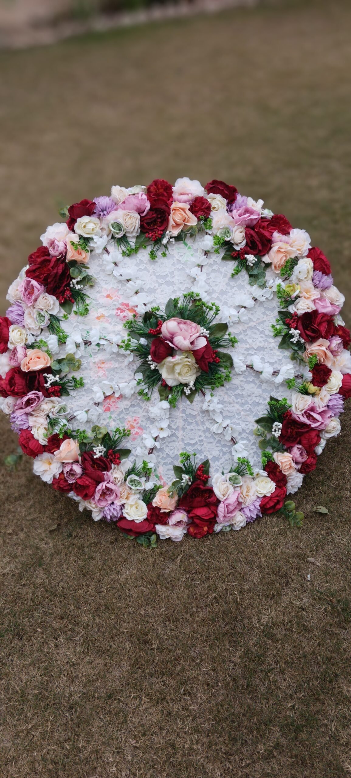 Wooden floral parasol for bridal entry. Color can be customized.